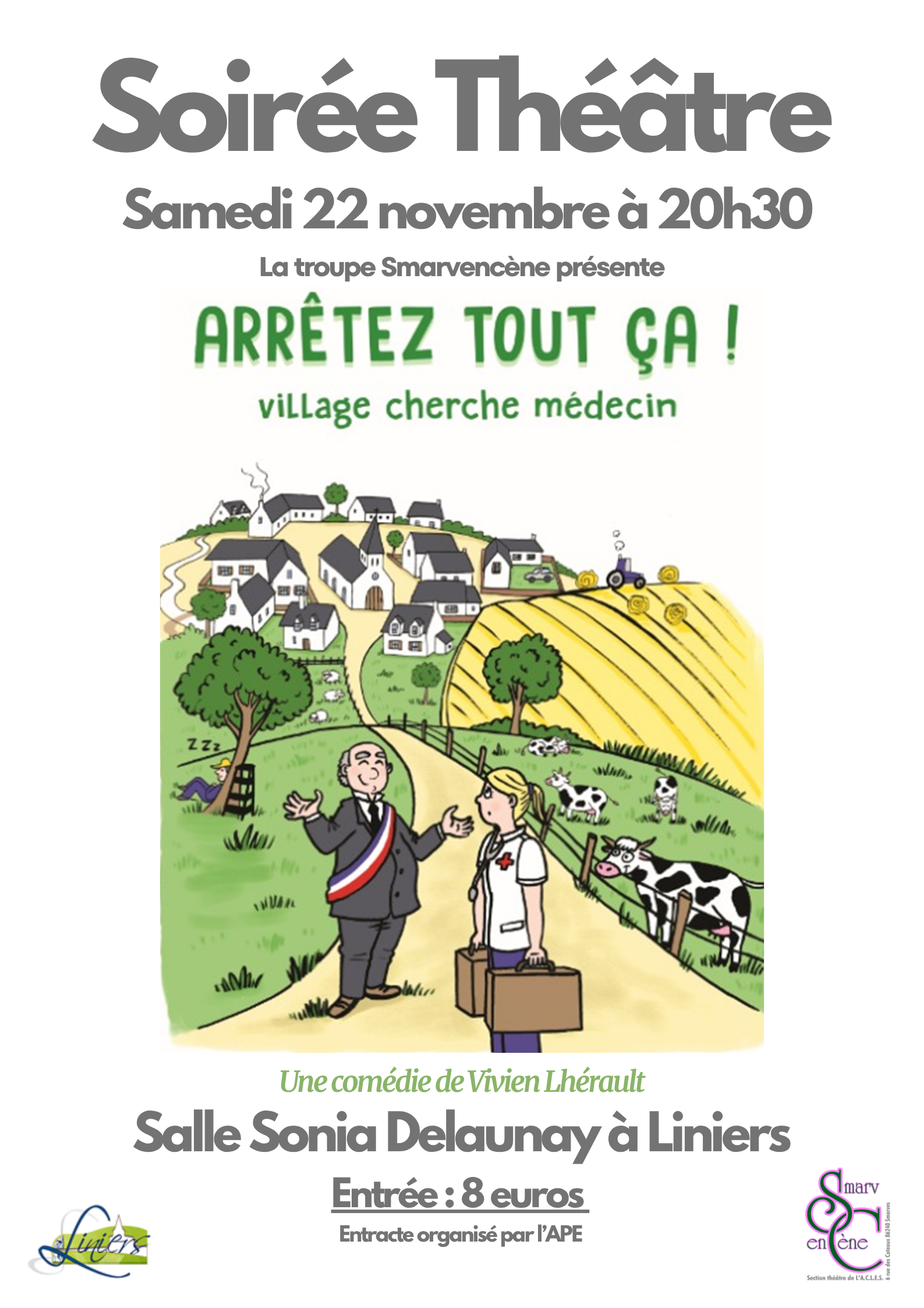 Soirée Thêatre avec la troupe smarvenscène avec une pièce intitulée "Arrêtez tout ça" à 20H30. Entracte organisé par l'APE . Tarif 08 euros